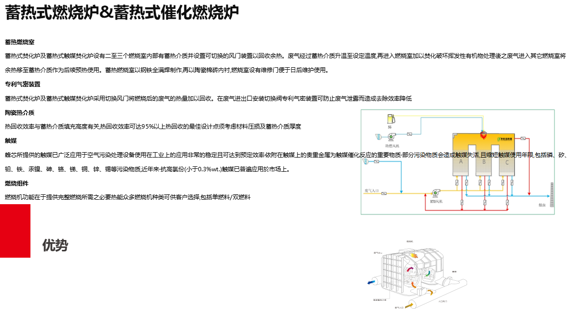 蓄热燃烧室蓄热式焚化炉及蓄热式触媒焚化炉设有二至三个燃烧室内部有蓄热介质并设置可切换的风门装置以回收余热。